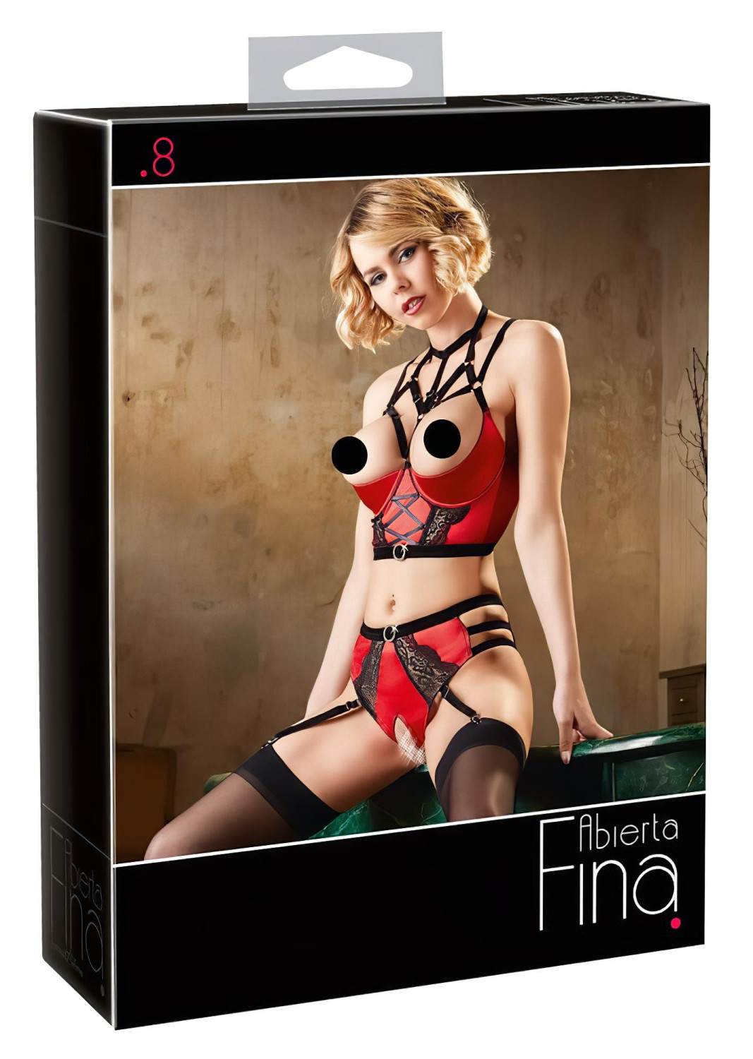 Впечатляващ и неустоим комплект бельо в смел и елегантен стил, който е уникален благодарение на ремъчните детайли, черната дантела и блестящите стразове - Abierta Fina комплект с повдигач с пръстен!