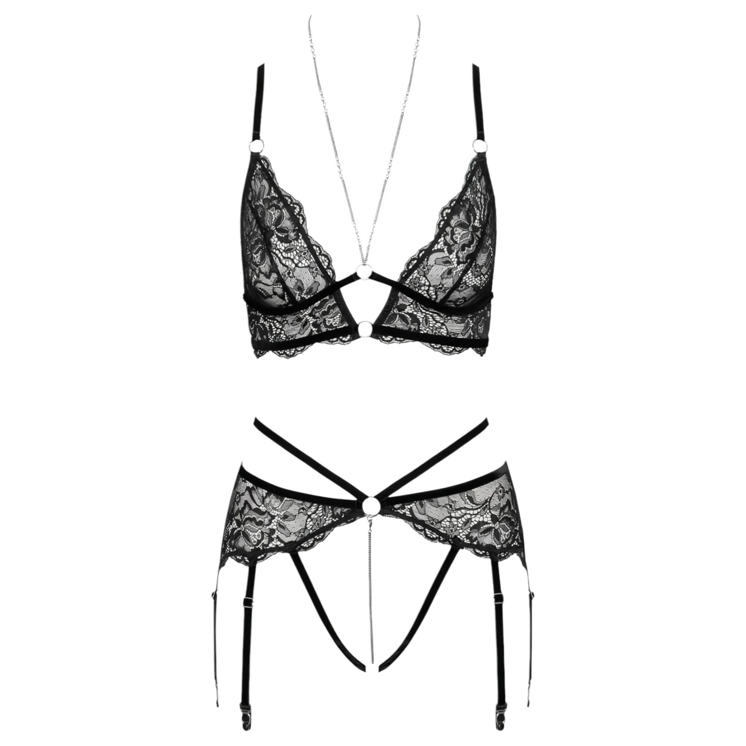 Секси комплектът дантелено бельо гарантирано ще разпали страстите. Меката, удобна дантела нежно приляга към кожата, а отворената прашка и сутиен оставят вълнуващи детайли открити. Сребристата верижка придава специален, провокативен блясък на комплекта, който блести като бижу върху тялото. Жартиерът допълнително усилва секси визията, което го прави перфектен избор за гореща, интимна вечер.
