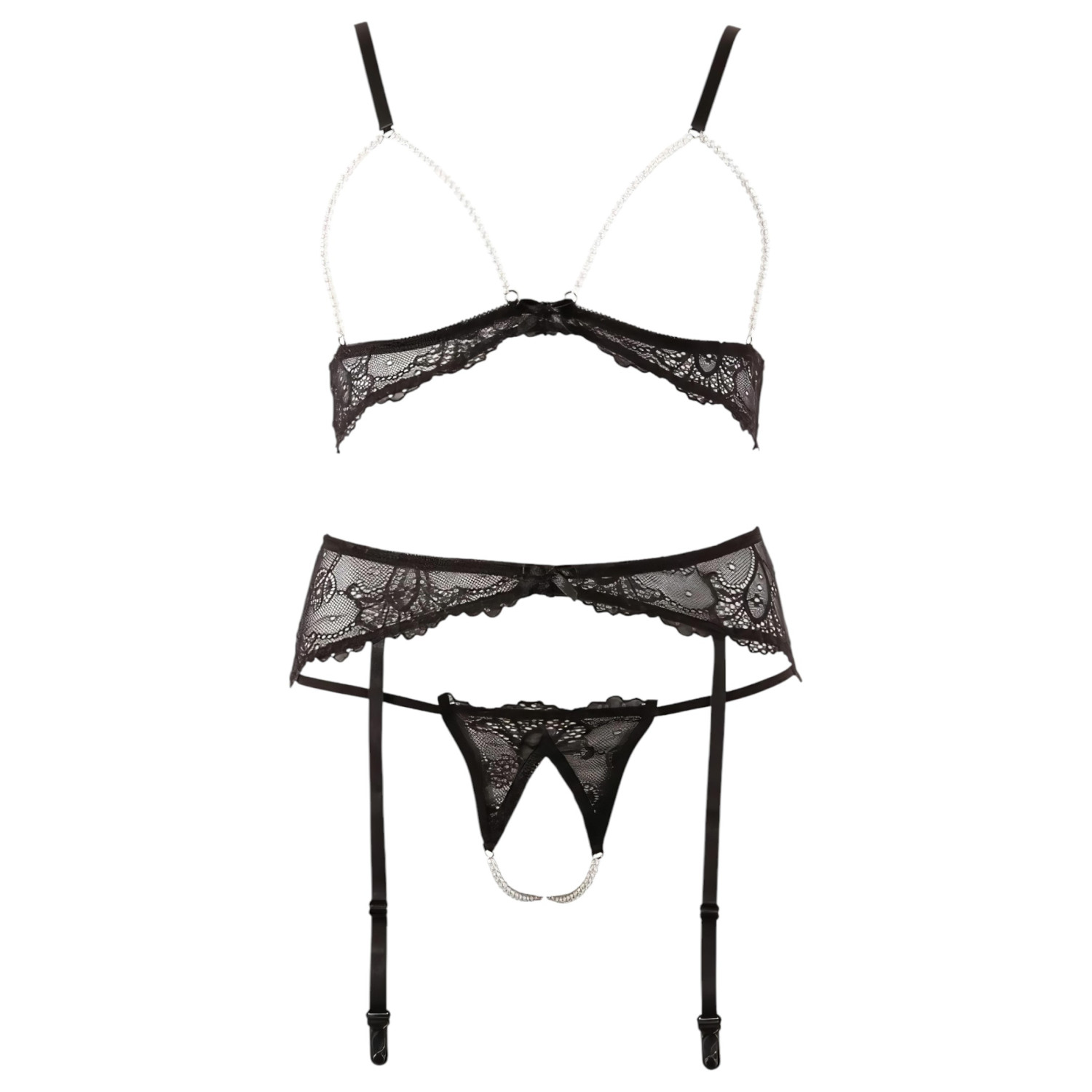 Комбинацията от секси дантела и перлени детайли е едновременно елегантна и предизвикателна. Регулируемите презрамки на сутиена и жартиерите гарантират, че ще пасне перфектно на тялото ви, докато отвореното танга гарантира максимална съблазън. Този комплект не е просто бельо - това е чувствено преживяване, което подчертава женствеността ви и повишава самочувствието ви.