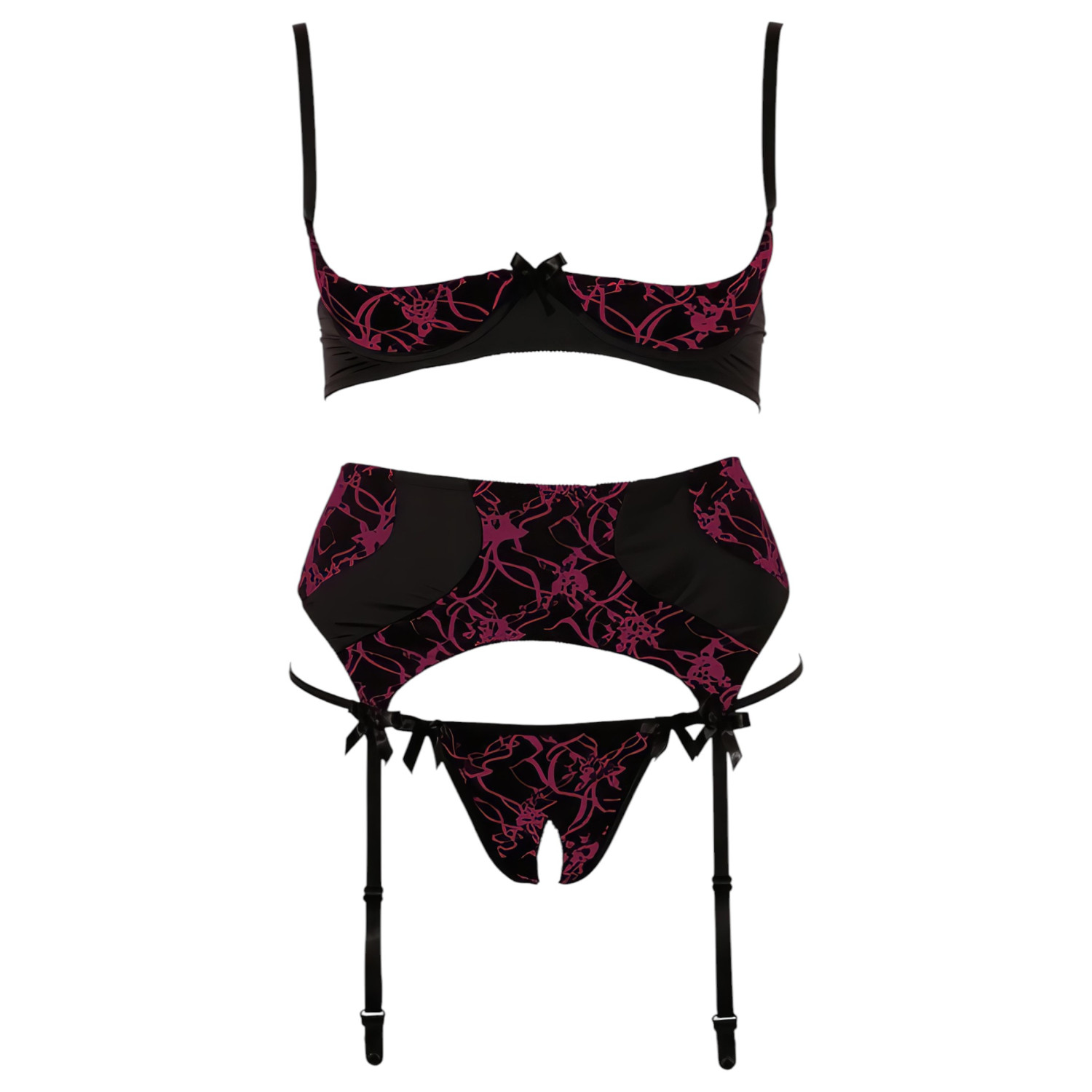 Този впечатляващ бельо комплект с ексклузивни бродерии, прозрачен материал и дързък дизайн гарантирано ще привлече вниманието към вас. Идеален избор за специални поводи или романтични вечери, когато искате да покажете женствеността си в най-съблазнителната й форма.