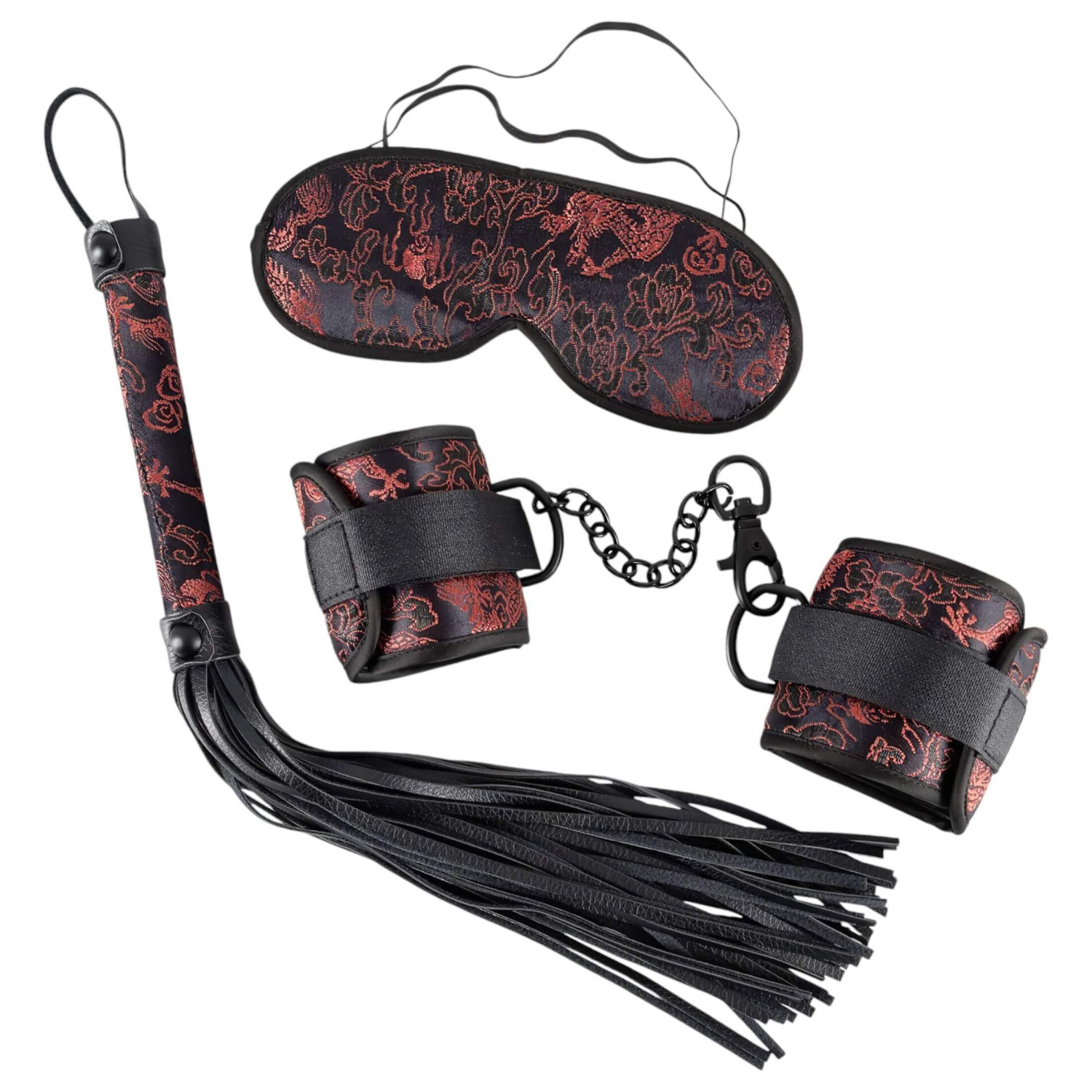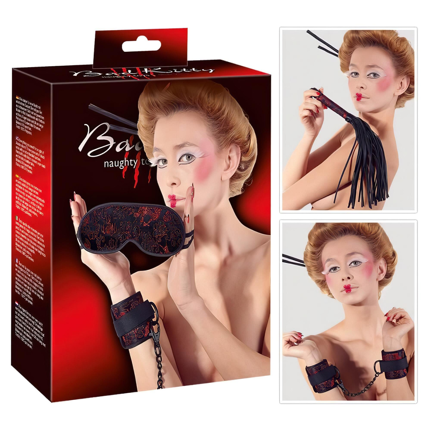 Открий нови измерения на страстта с този стилен, трикомпонентен бондаж сет от черен сатен с червен десен.