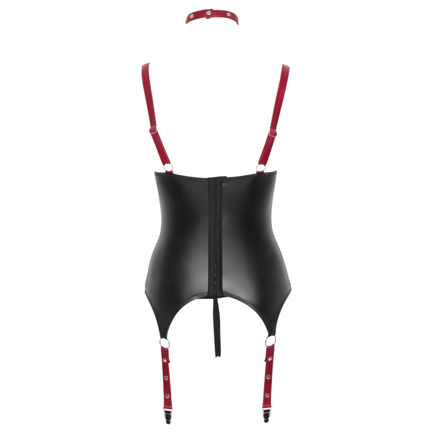 Опасно червени презрамки, лъскав черен плат и аксесоари с капси - този комплект е истинско изкушение, съчетаващо съблазън и доминация в идеален баланс.