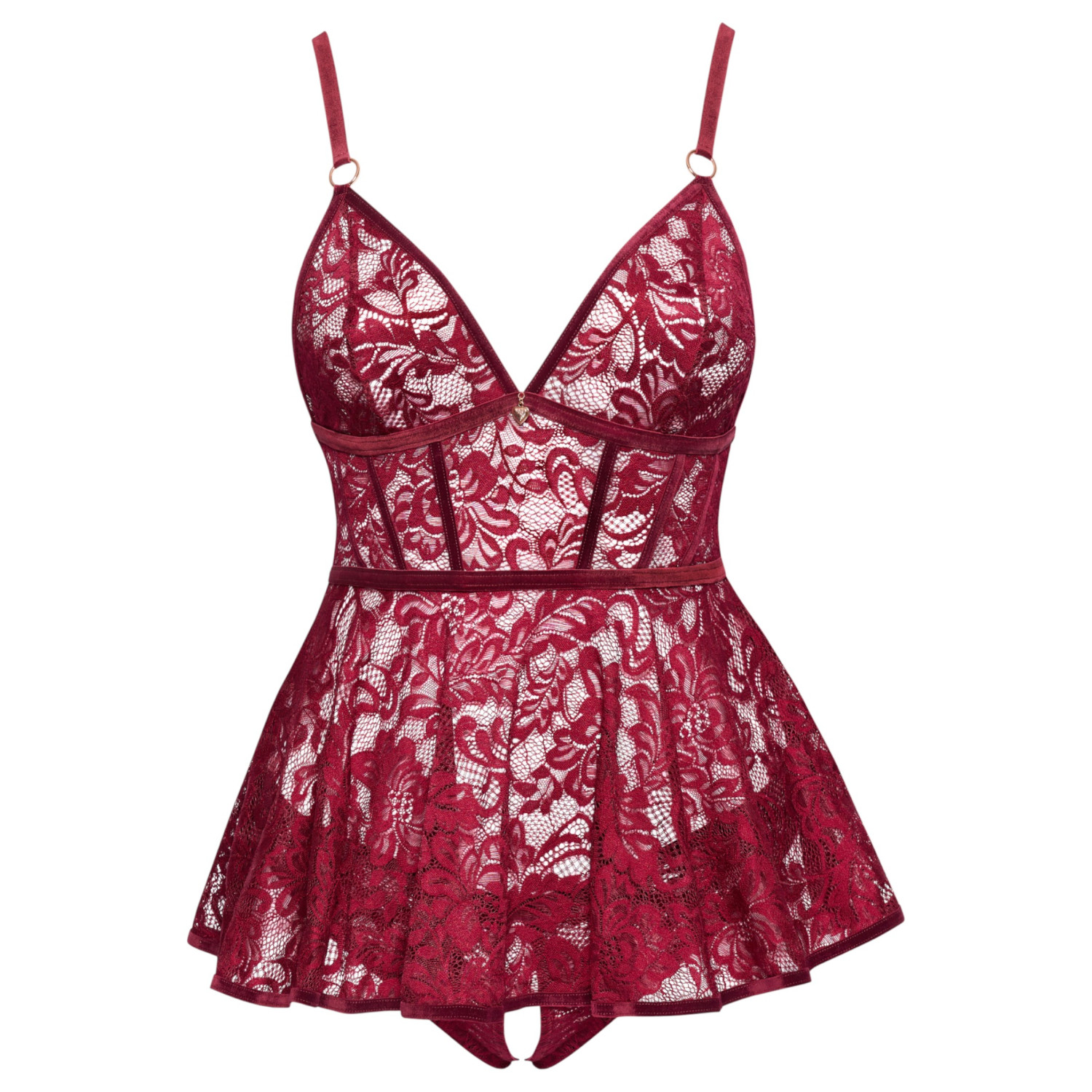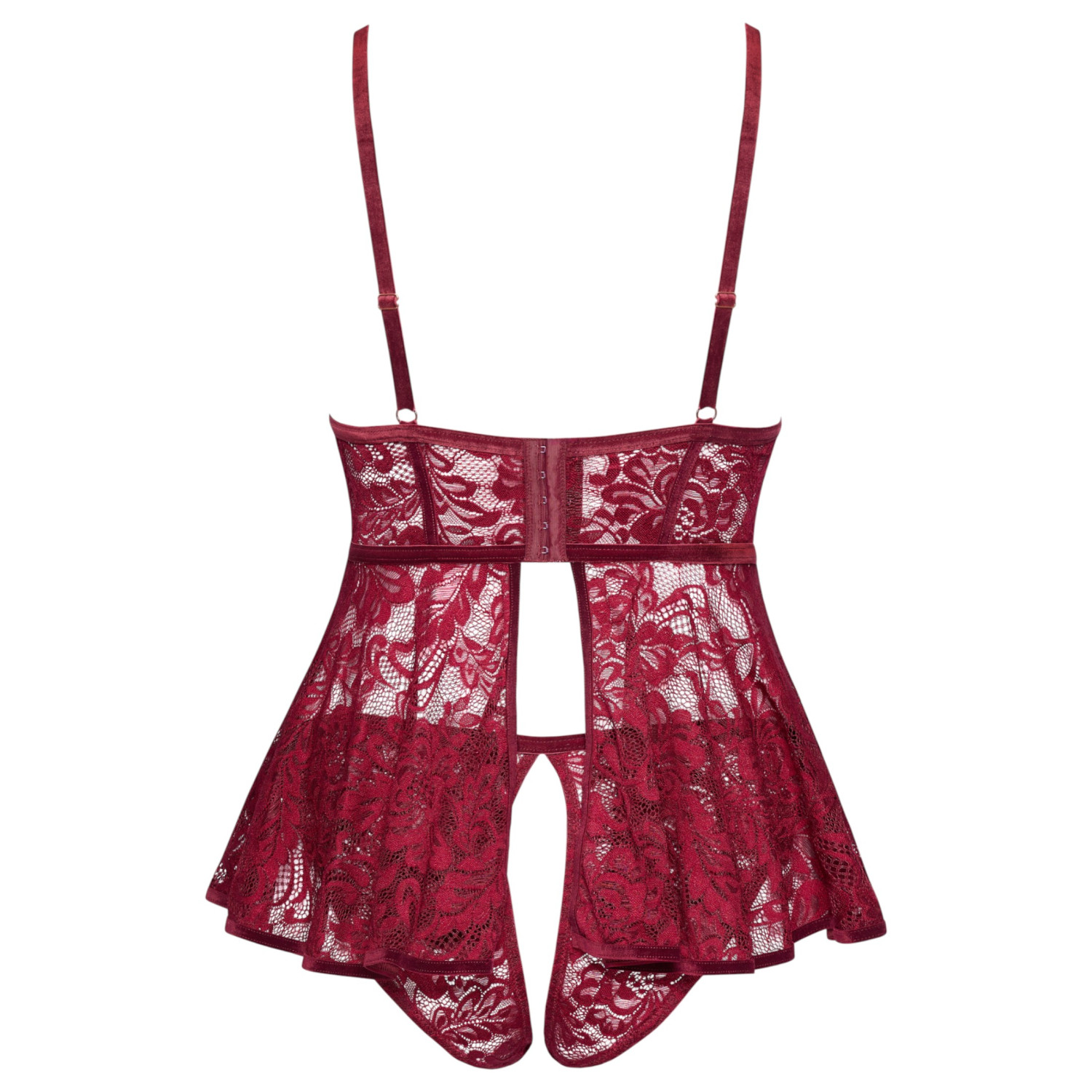 Комплектът Cottelli Curves дантелена мини рокля е перфектен избор, ако искате да подчертаете своята женственост и да носите изключително съблазнително, но в същото време удобно бельо. Комбинацията от дантела и мека, еластична материя прилепва прекрасно към тялото, докато отворената, разширяваща се фуста на гърба придава елегантен и еротичен вид. Вместо с подвижни вериги, кадифените ремъци и розово-златни аксесоари осигуряват ексклузивен външен вид. Подходящата отворена прашка завършва съблазнителността.