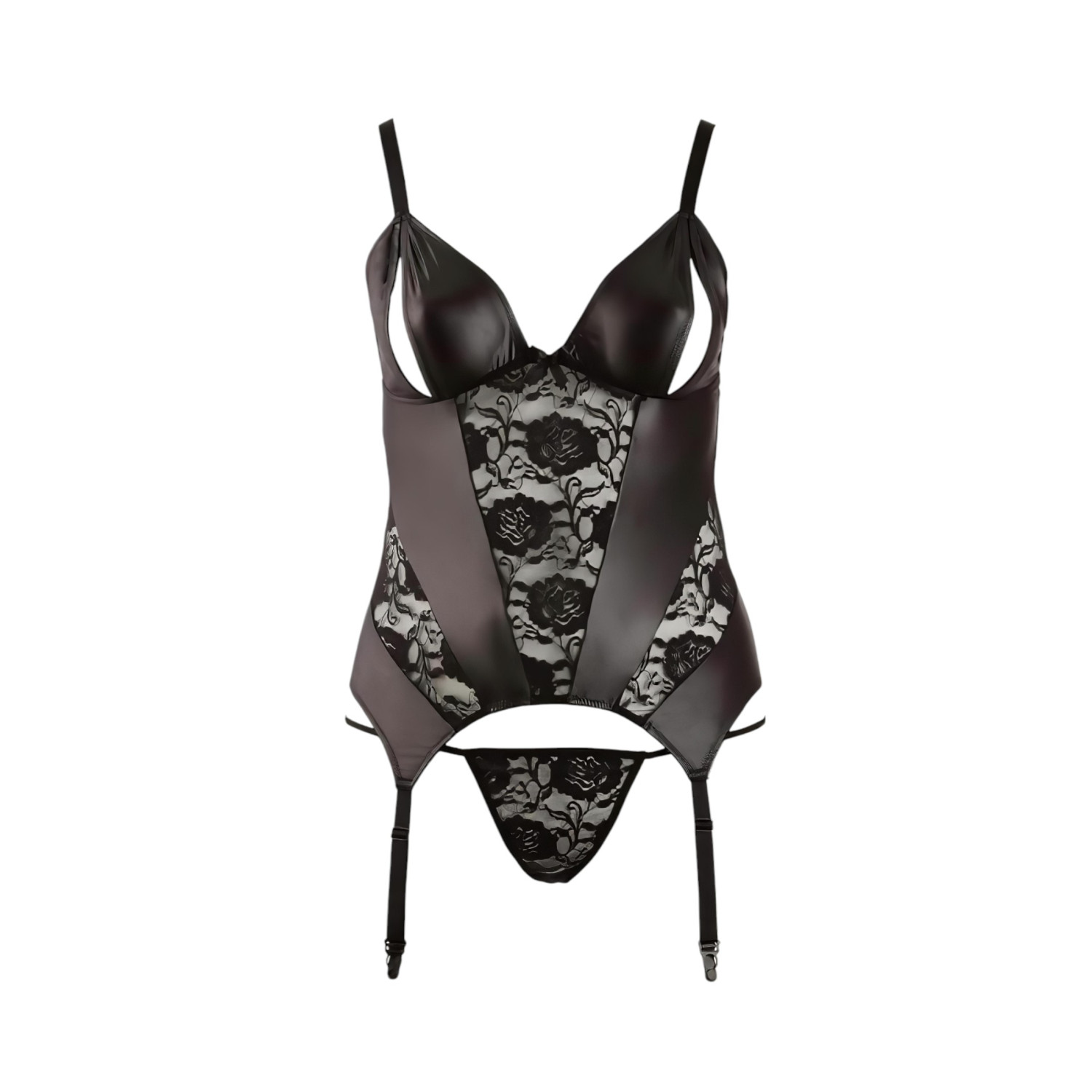 • Дизайн: Отпред лъскав мокър ефект, отзад прозрачен и еластичен, отворен бюст, регулируеми раменни презрамки и колан за чорапи