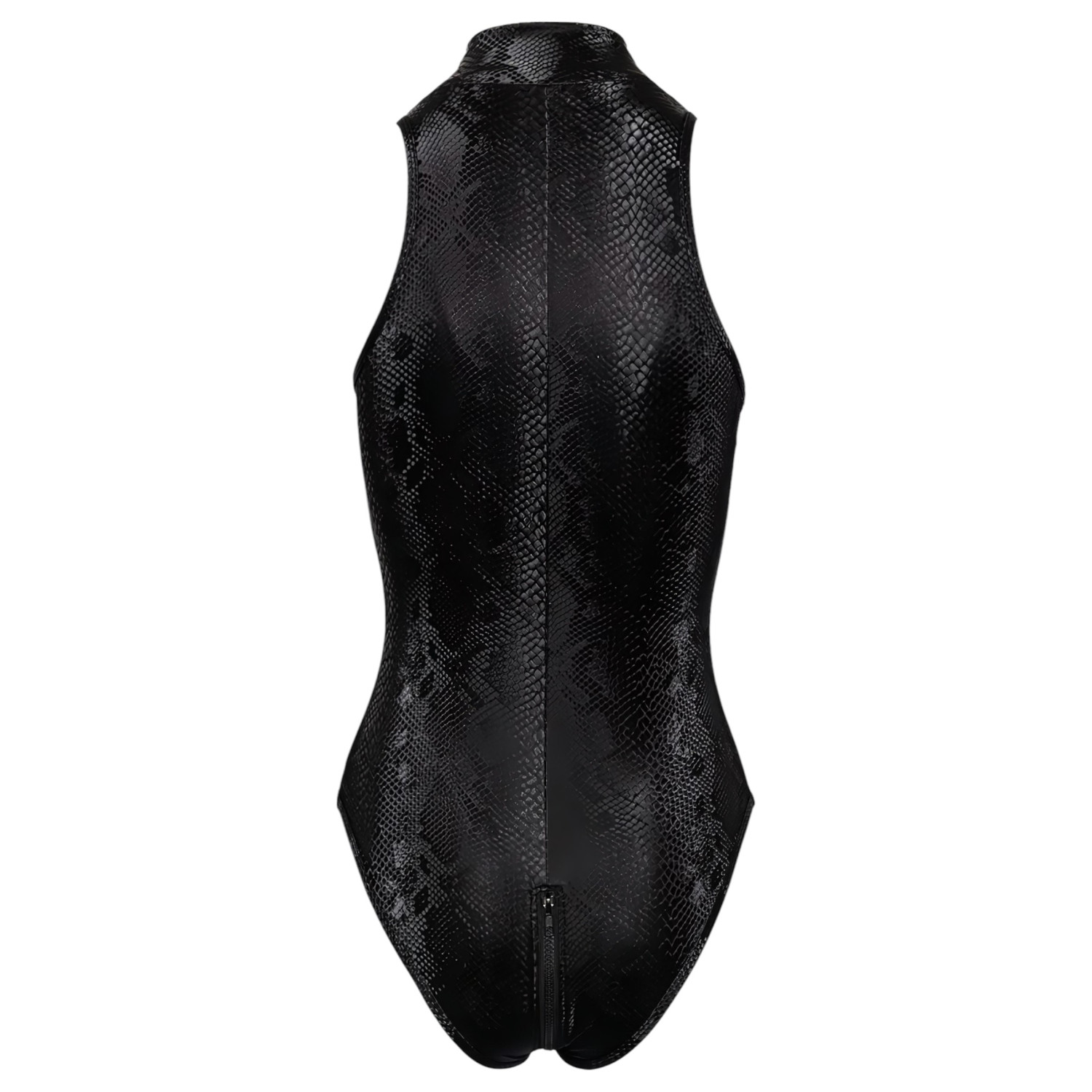 Боди с имитация на змийска кожа, висока яка и двупосочен цип от яката чак до дупето! Със сатенения си блясък и змийски мотиви ще изглеждаш опасно съблазнителна и загадъчна!