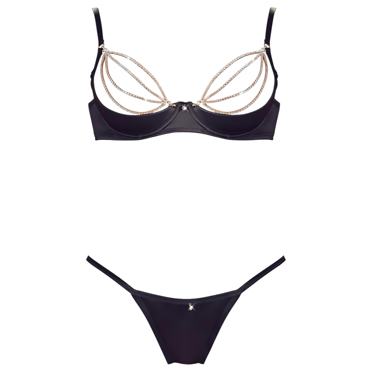 Cottelli - сатенен комплект с верижка и страсове (черен) - 85C/L