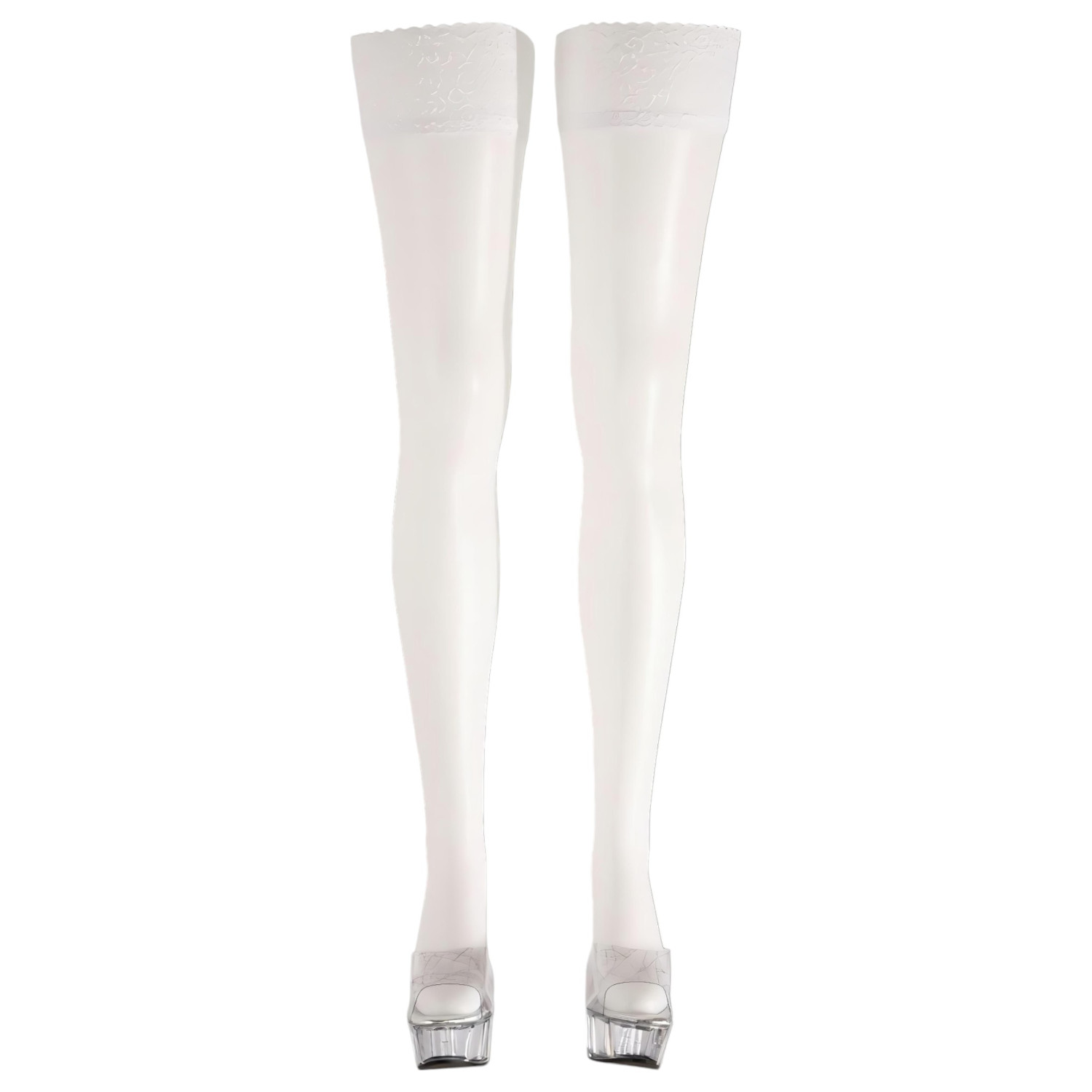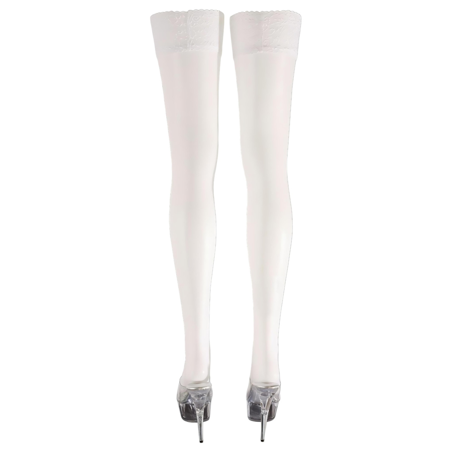 Прозрачен, до бедрата дамски чорап с широка дантелена горна част.