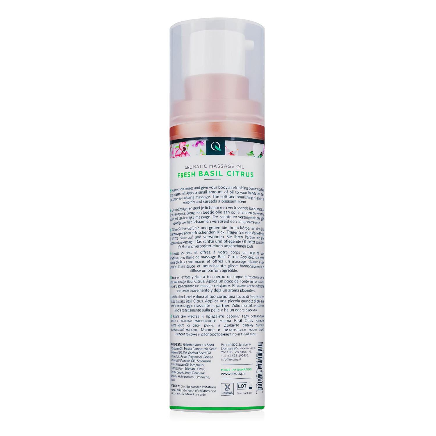 Състав:Helianthus Annuus Seed Oil (слънчогледово олио), Brassica Campestris Seed Oil (рапично олио), Vitis Vinefera Seed Oil (гроздово олио), Parfume (аромат), Persea Grattissima Oil (авокадово олио), Sesamum Indicum Oil (сусамово олио), Tocopherol (витамин Е), Benzyl Salicylate, Citral, Citronellol, Geraniol, Hexyl Cinnamal, Butylphenyl Methylpropane, Limonene, Linalool.