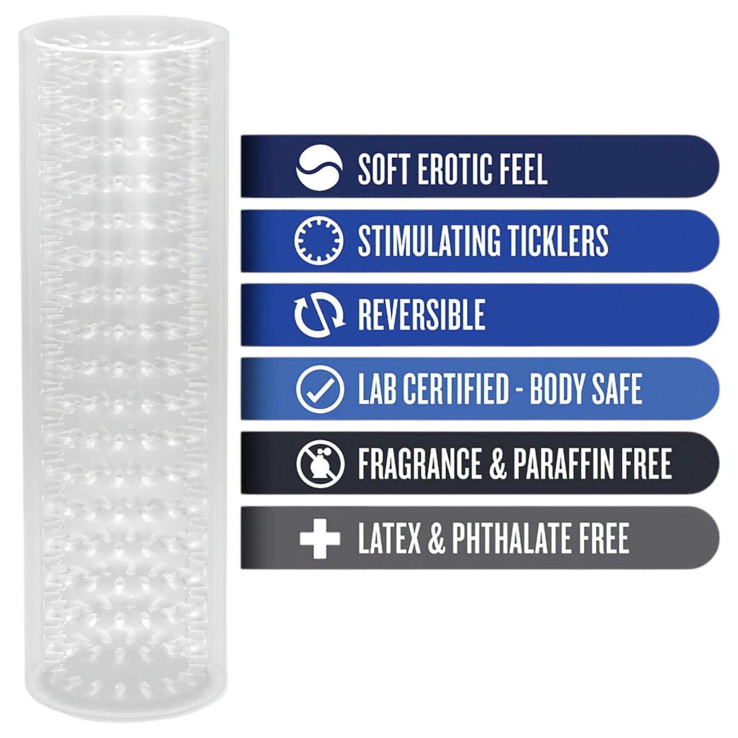 Този еластичен и мек мастурбатор плътно обгръща пениса, осигурявайки пълно потапяне и засилена стимулация. Вътрешните миниатюрни шипове нежно масажират пениса, докато прозрачният дизайн предлага и визуално удоволствие. Отвореният край позволява приспособяване към всякаква дължина на пениса и може да се използва с партньор по време на любовна игра или орална стимулация.