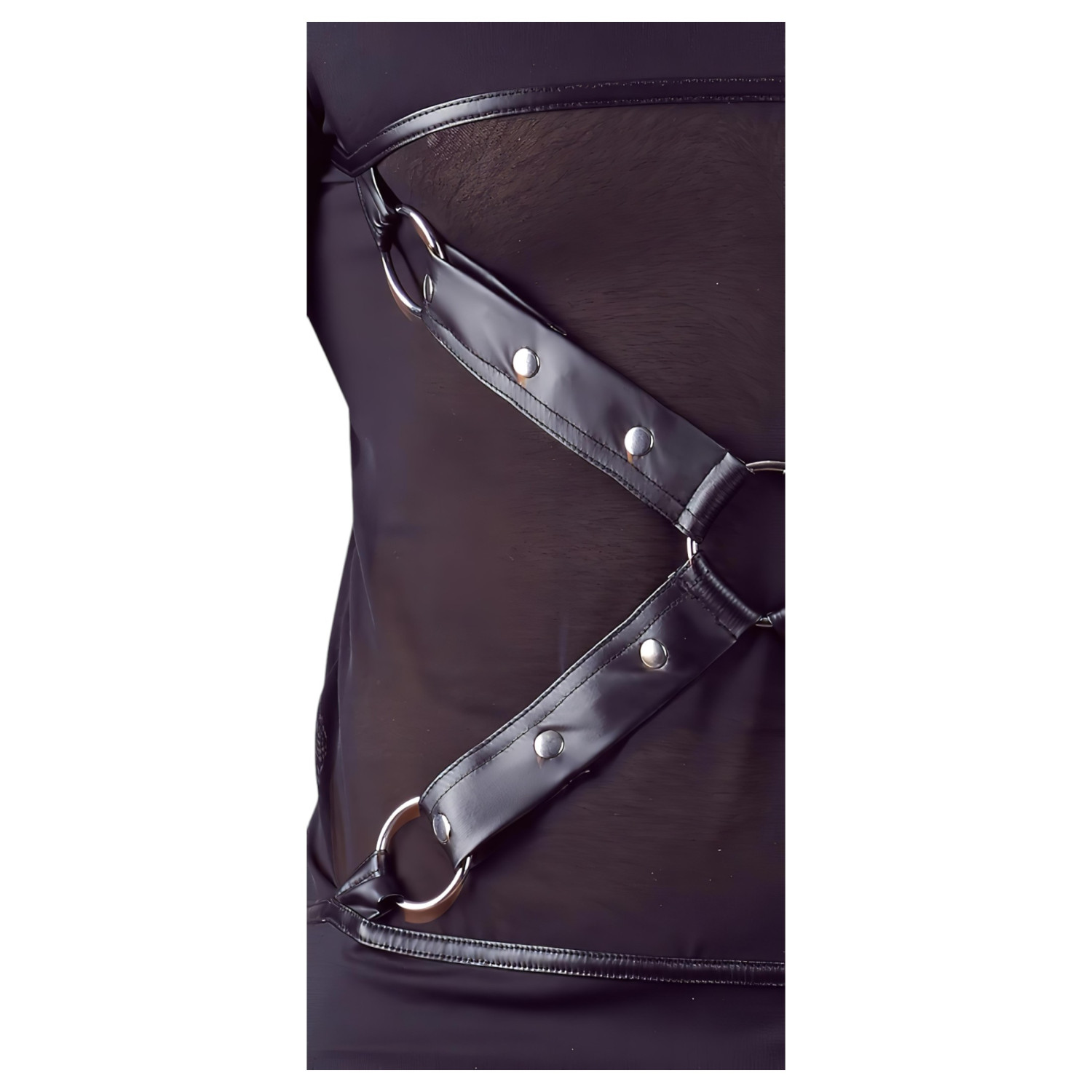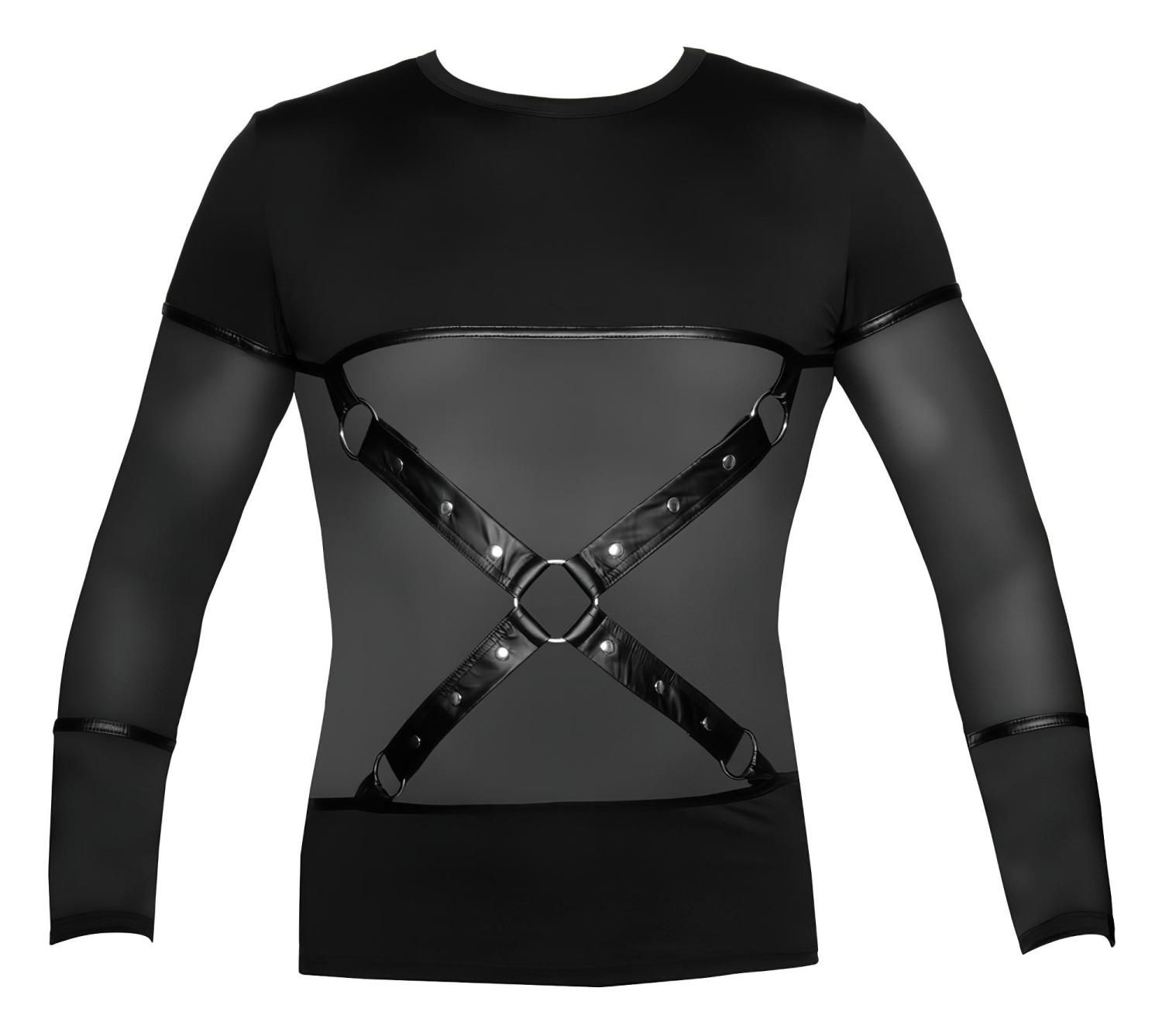 Секси мъжка горна част от нежен, копринен материал с кръстосани презрамки и полупрозрачни мрежести акценти.