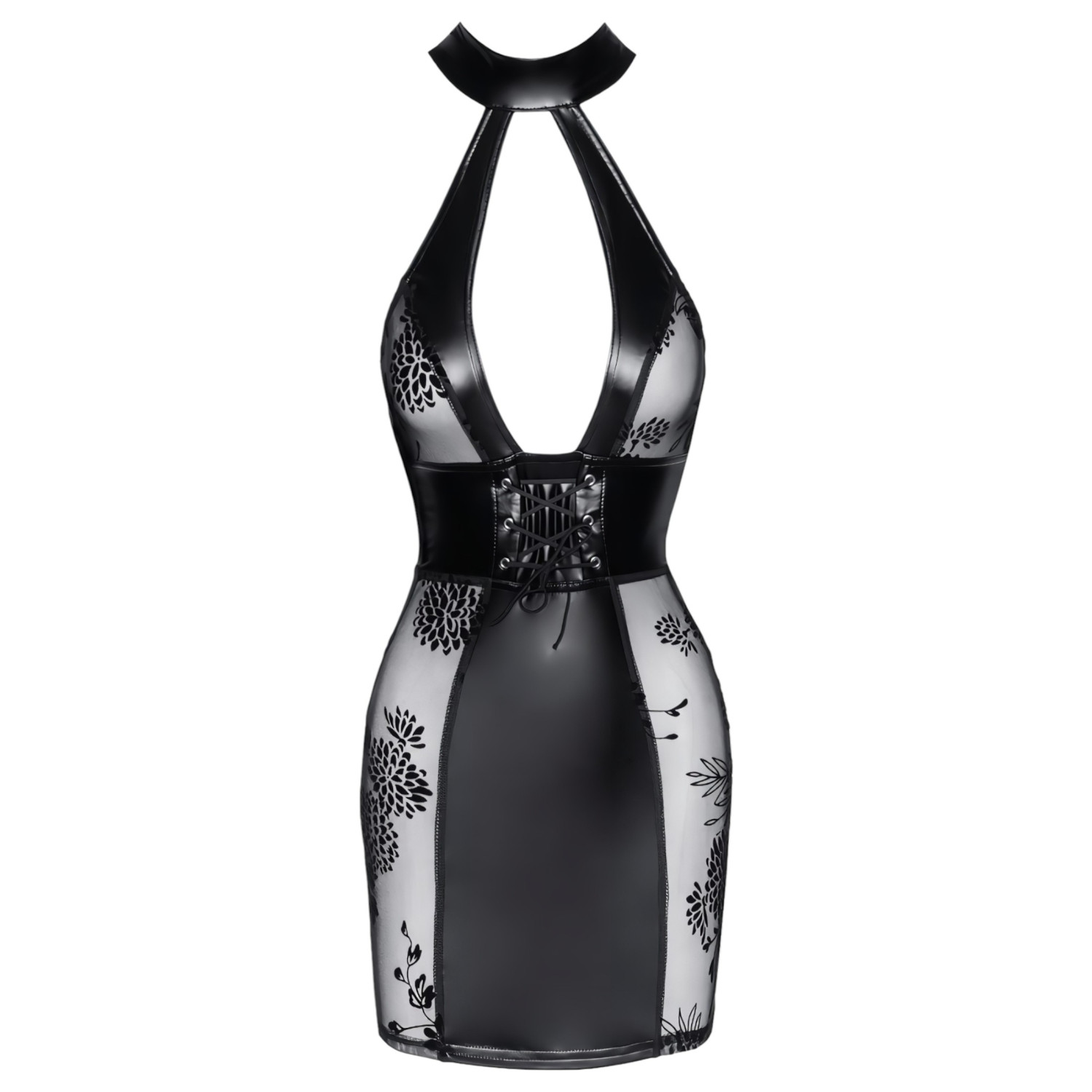 • Прозрачни детайли: На горната част и отстрани на полата има флорални прозрачни елементи, които съблазнително загатват за гола кожа и зърната.