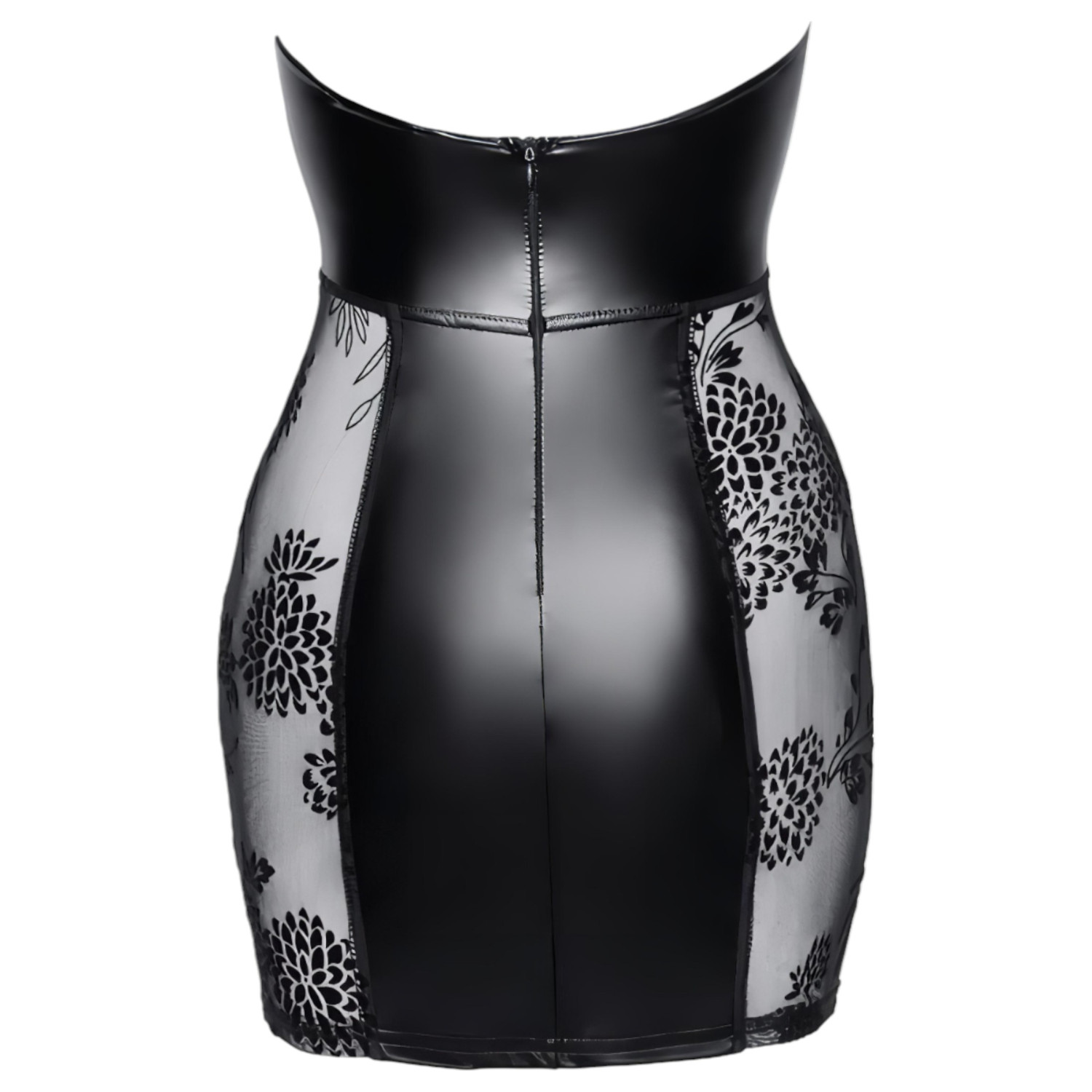 • Прозрачни детайли: На горната част и отстрани на полата има флорални прозрачни елементи, които съблазнително загатват за гола кожа и зърната.