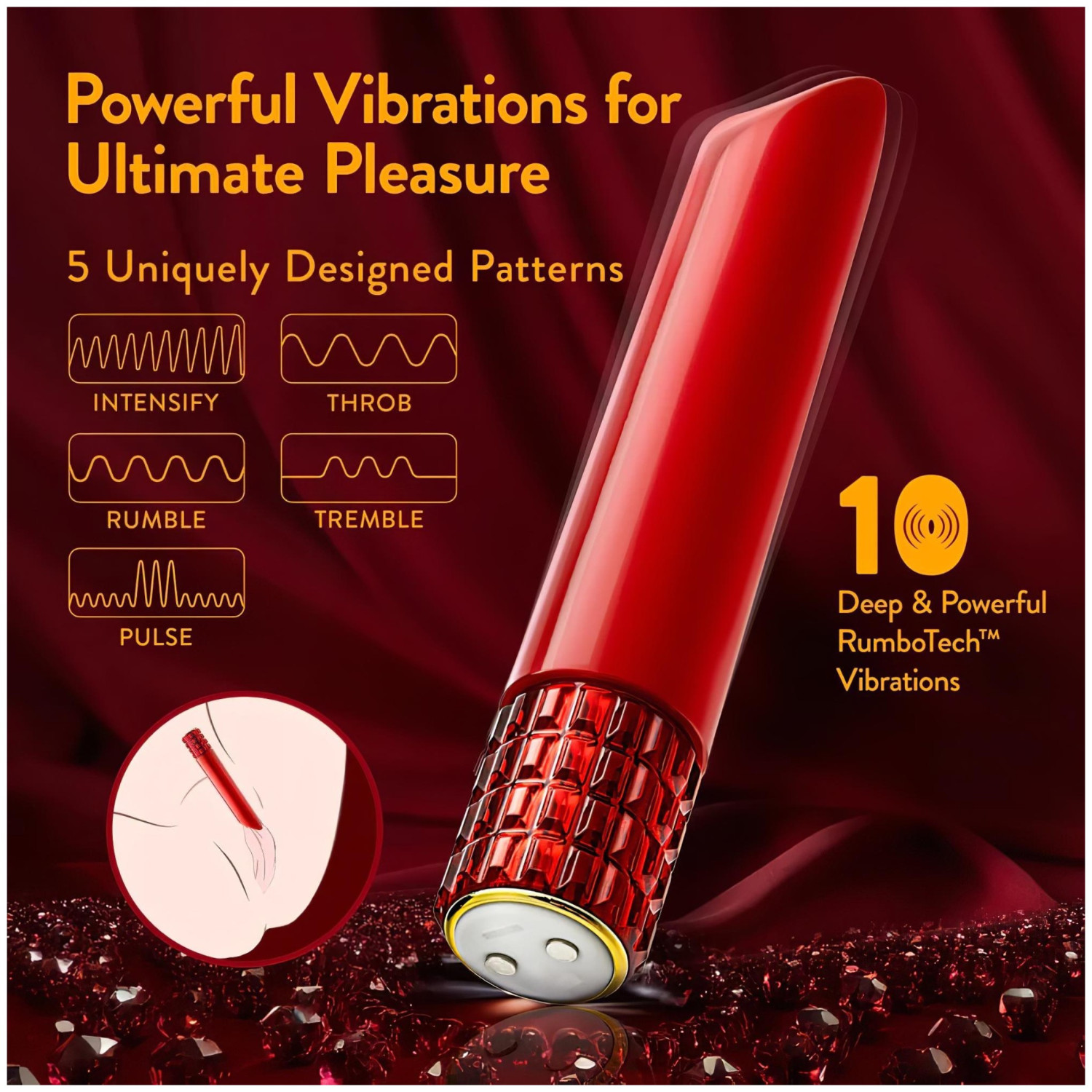 Oh My Gem Desire не е просто луксозен на вид вибратор, а и партньор, който подобрява изживяването с мощния мотор RumboTech™ и 10 разнообразни вибрационни режима. Благодарение на компактния си размер, можете да го вземете навсякъде със себе си и да му се наслаждавате дори във ваната, тъй като е водоустойчив. Функцията за затопляне предлага още по-интимно изживяване, докато материалите, безопасни за тялото, осигуряват максимален комфорт и безопасност.