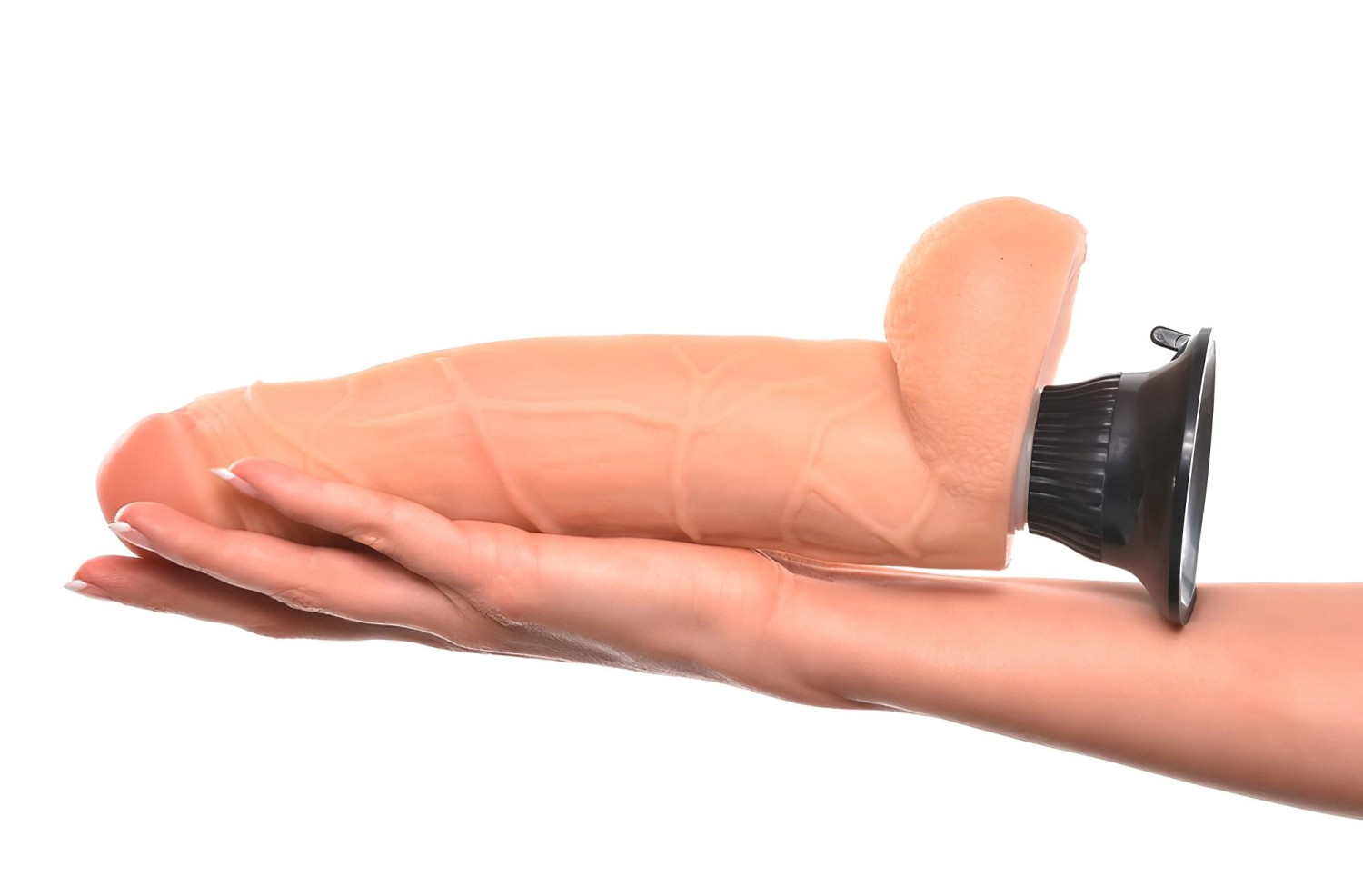 Реалистичен вибратор в естествен цвят с заоблени тестиси, гъвкав и много мек на допир, усещането е кадифено като истинска кожа.