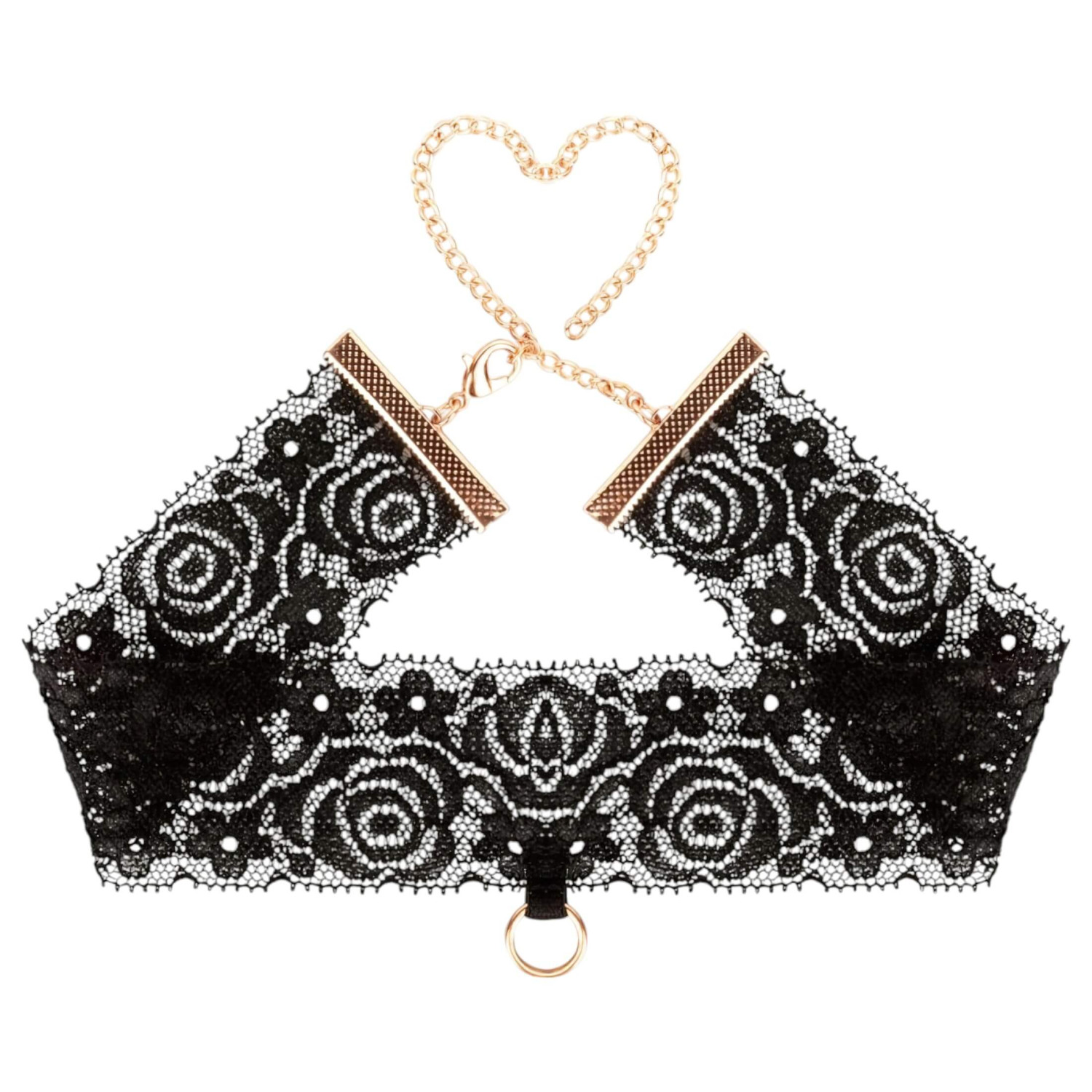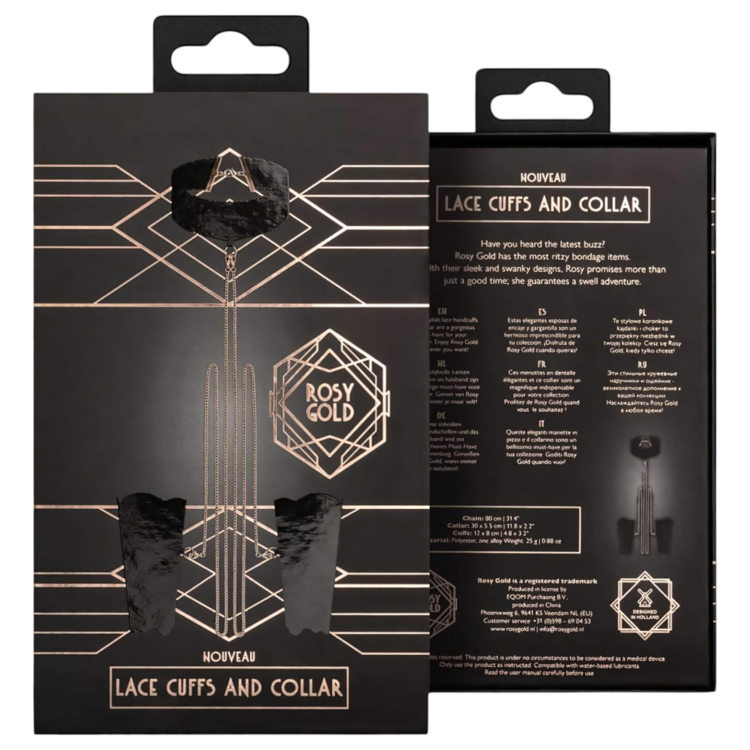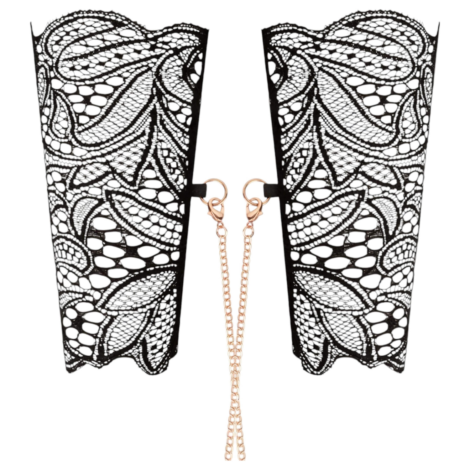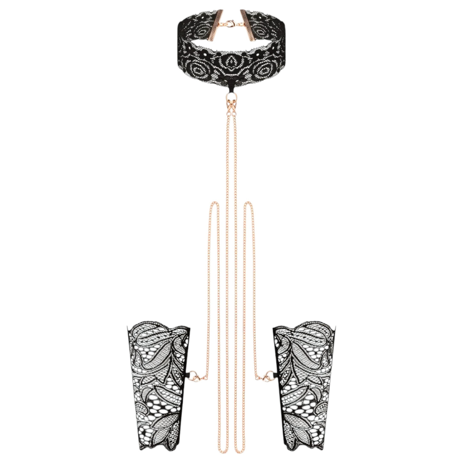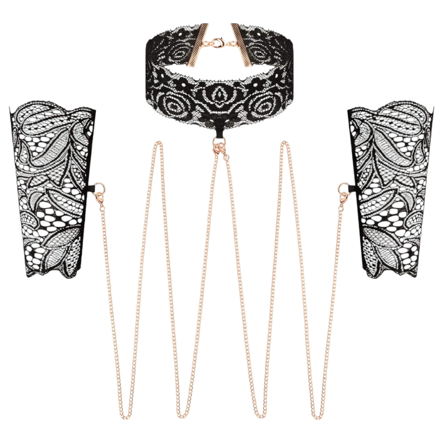 Този стилен сет от якичка и белезници е изработен от елегантна черна дантела, свързани със златисти верижки.