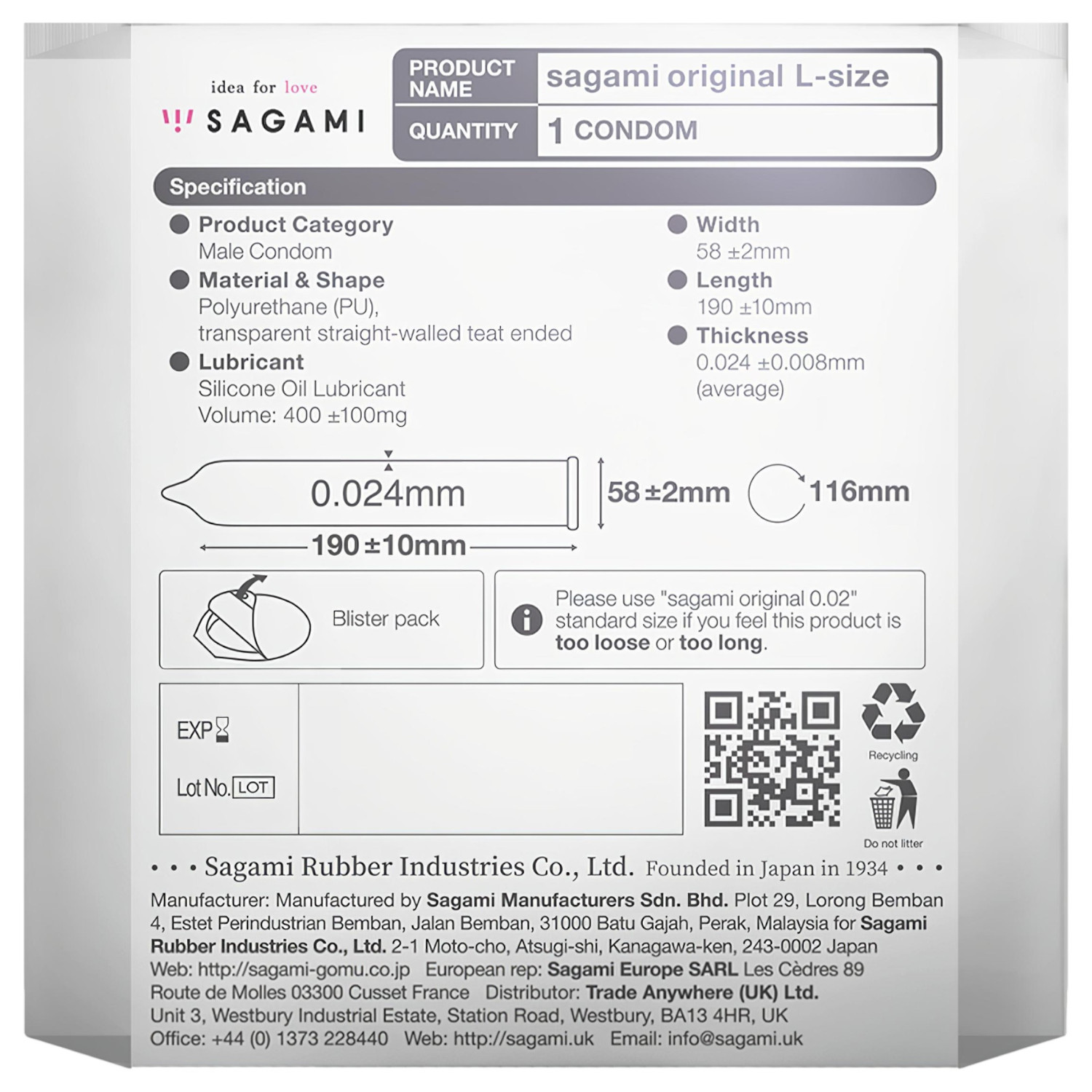 Sagami Original 0.02 L-Size (1 бр.) е ултратънък, безлатексов презерватив, който осигурява естествено усещане кожа-кожа за еднократна употреба.