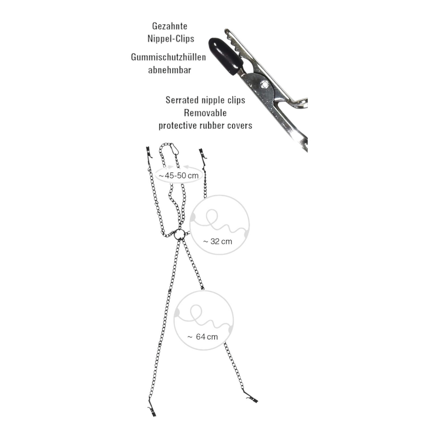 Постави пръстена с диаметър 3,5 см между гърдите, закачи огърлицата около врата с карабинера. Верижките за зърната се фиксират с щипките, а по-дългите верижки - към срамните устни. Всичко това гарантира силно, доминиращо изживяване.