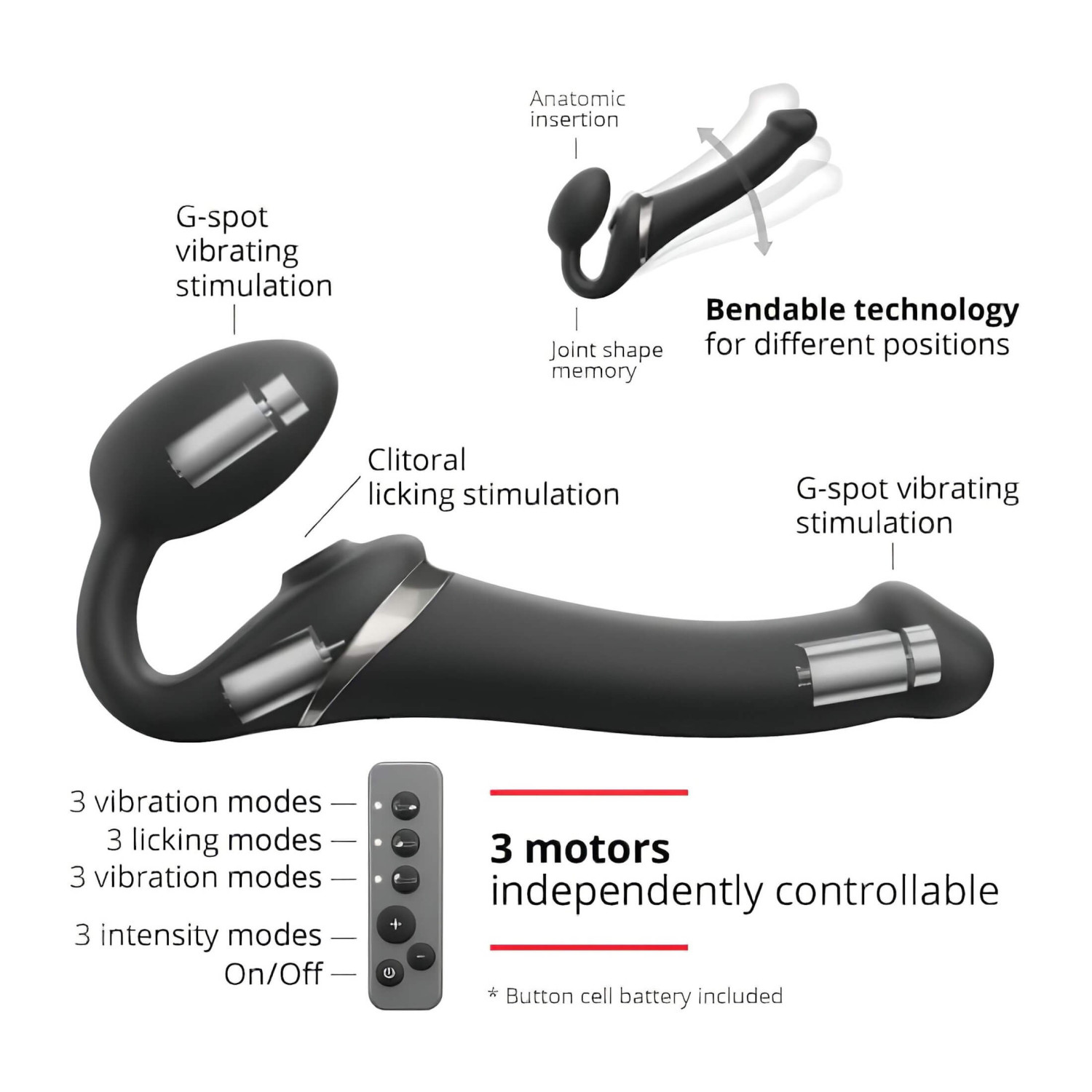 Този премиум страп-он вибратор с три мотора и въздушна стимулация на клитора вдига удоволствието на ново ниво — и за двамата!
