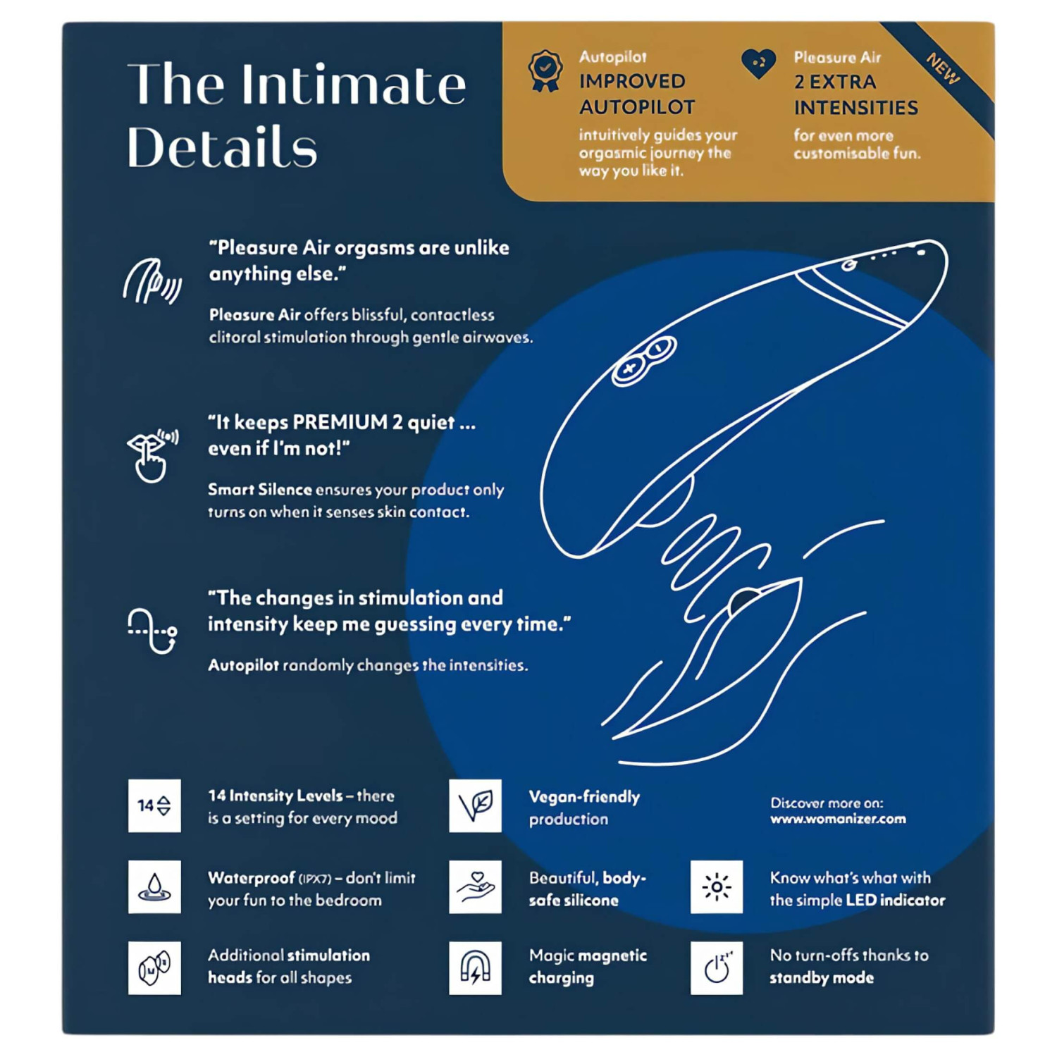 Womanizer Premium 2 е луксозен стимулатор за клитор, изработен със най-съвременна технология, който революционизира интимното изживяване. Безконтактната въздушна стимулация е достъпна на 14 нива на интензивност, докато интелигентната функция Smart Silence осигурява дискретна работа. Autopilot Mode случайно променя интензитета, така че всяко използване е уникално и незабравимо преживяване.