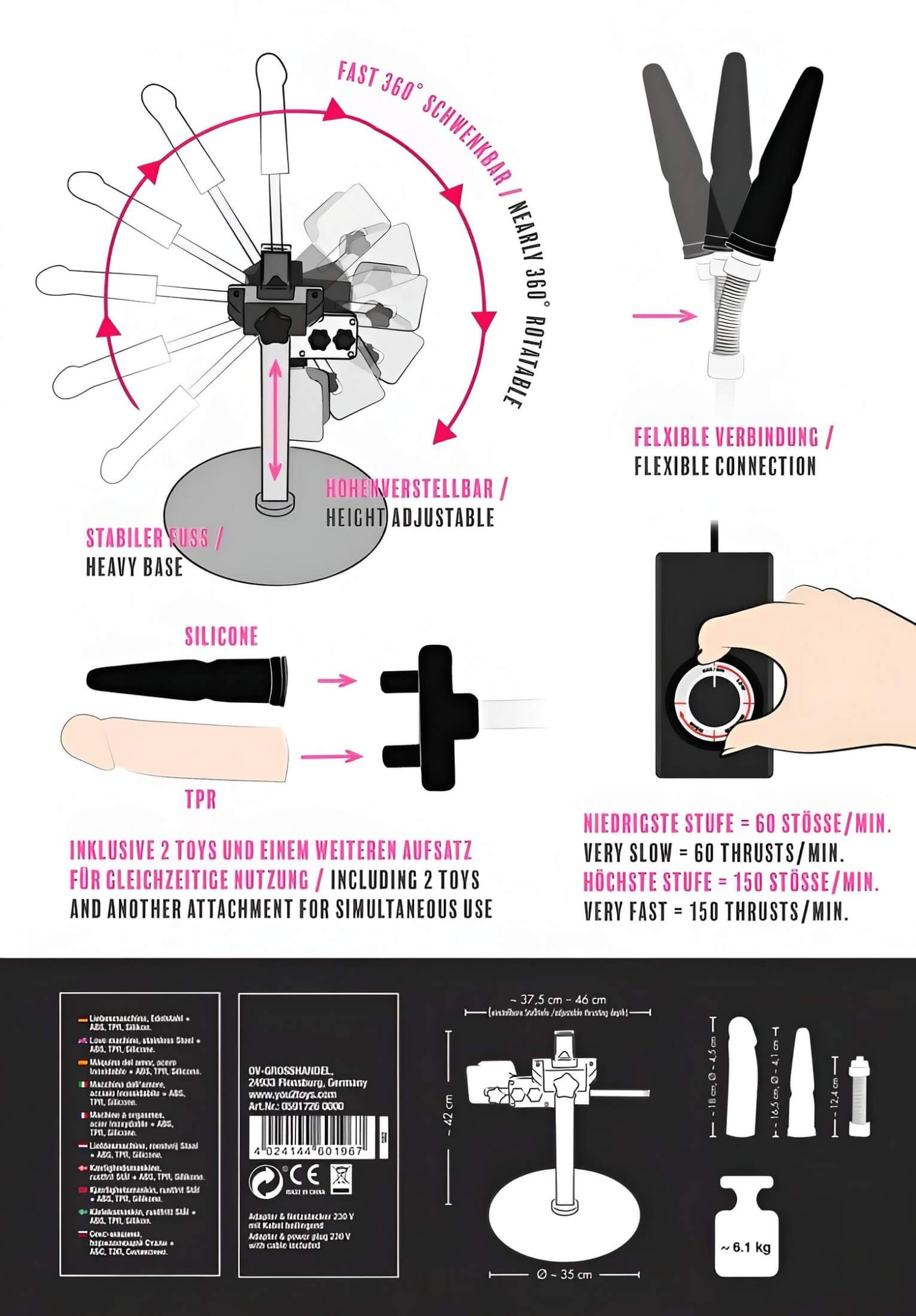 Сглоби машината според инструкциите, избери желаната глава (единична или двойна), сложи дилдото/дилдата и включи в контакта. Настани се удобно, вземи безжичното дистанционно и се приготви за разтърсващ секс! С копчето лесно регулираш скоростта - остави машината да върши работата вместо теб.
